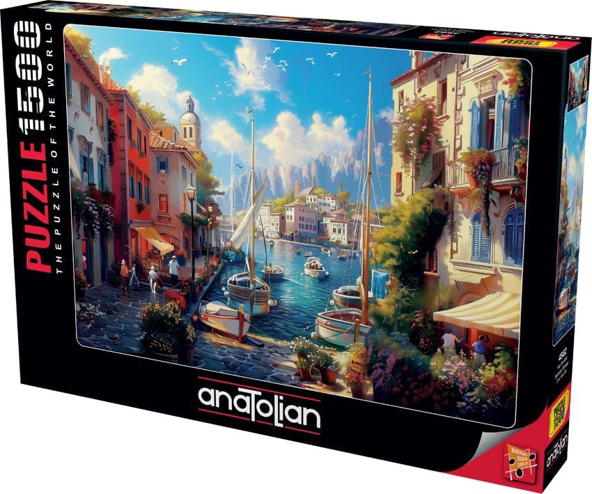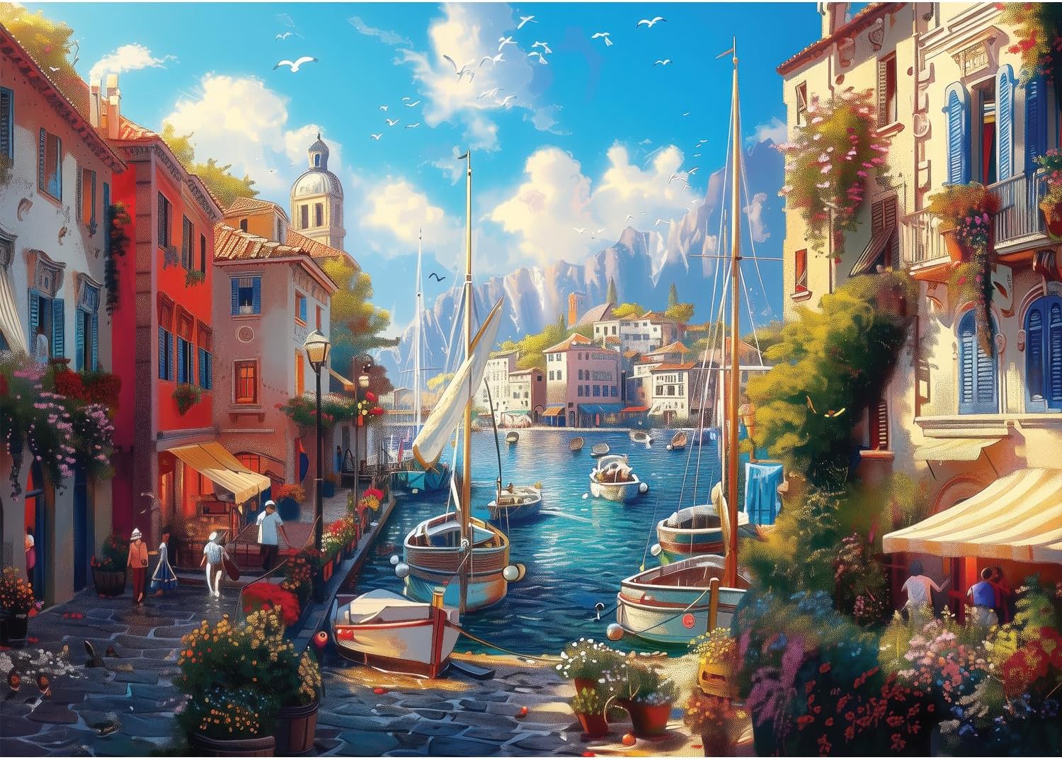 Harbor boats and sailboats line a peaceful street in this breezy 1500-piece jigsaw puzzle of summer joy. Gentle waves and sunny vibes fill every corner with calm delight. A premium puzzle that captures the essence of carefree summer days and tranquil seaside serenity.