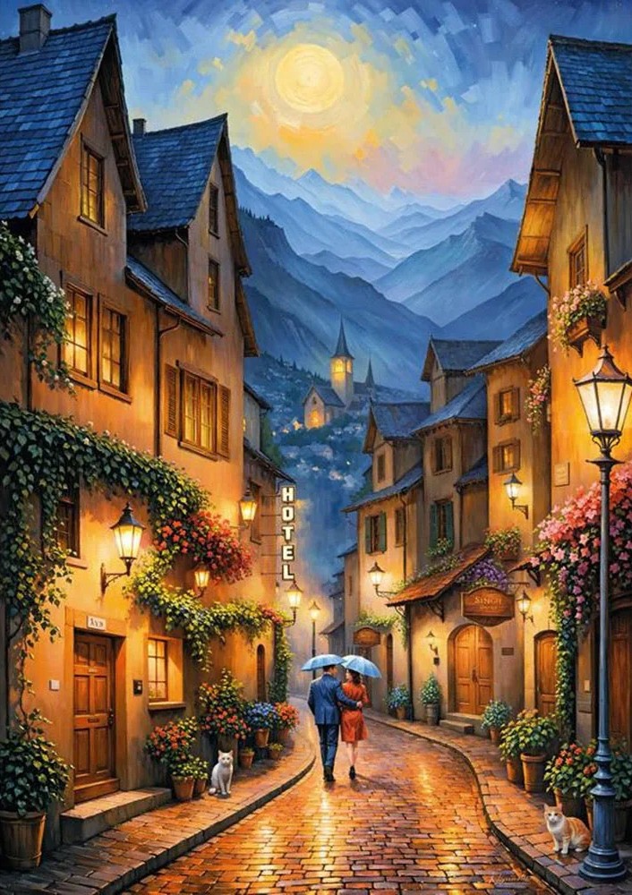 Gentle rain glistens on cobblestone streets as a two souls wander hand in hand, framed by charming houses. A romantic tribute to stillness, connection, poetry and the beauty of everyday moments. Nostalgia fill the air. It is a delightful journey into a world of warmth and whimsy.