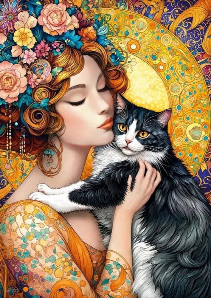 Puzzle with a great variety of spirals, flowers and ornate patterns, it is a world of dreams and warmth, where ‘the Beauty and the Beast’ are captured in an ethereal glow. Pay attention to the golden eyes of the cat gleam with a knowing mischief, comparing to the woman’s tranquil grace and tenderness. This is a silent harmony—the cat with its beautiful guardian.