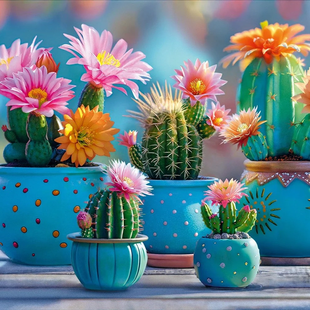 In the comfort of home, blooming cactus plants thrive in their pots. This vibrant illustration captures the feelings of peace and joy.