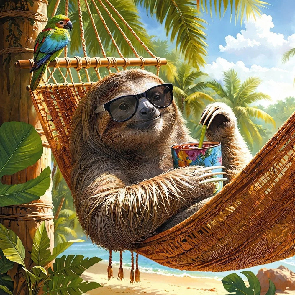 A charming painting of this cute sloth, lazily lying in a hammock, surrounded by tropical scenery. Its gentle eyes in cute sunglasses and content smile radiate pure relaxation, reminding us to slow down and enjoy the moment. Just no hurry, no worries.
