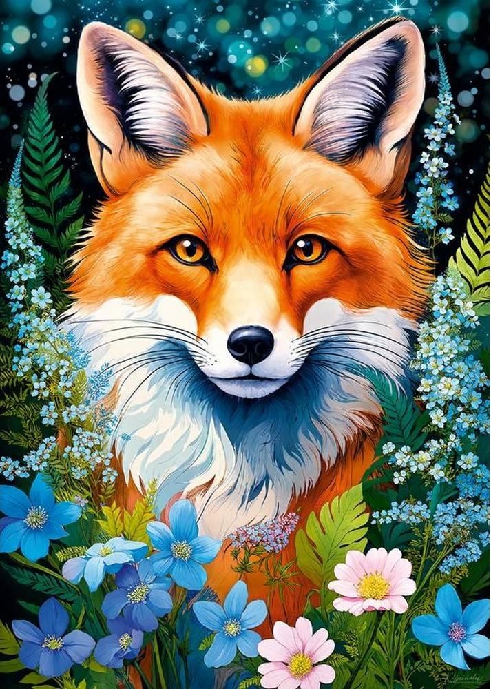 The fox, with its rich russet fur looks beautifully among a soft carpet of vivid blue and white flowers, creating a wonderful and subtle touch of mystique. This contrast between the fiery orange of the fox and the cool pastels of the flowers evokes a sense of balance, as though nature itself has woven a perfect moment of stillness and beauty. Discover this very moment!