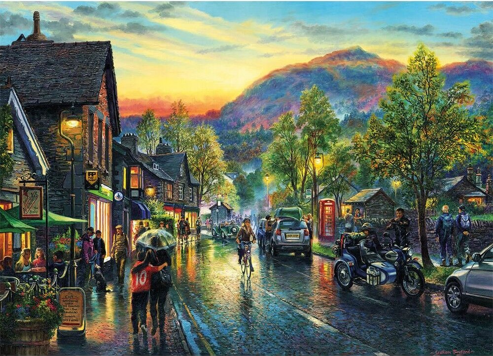 Escape to the country, and the beauty of the Lake District with Grasmere by Twilight, a delightful 1000-piece puzzle featuring the artwork of Graham Twyford. As evening settles over the peaceful cobbled streets, the bikers are ready to stop for a brew in Arundale’s café.