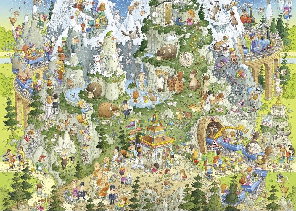 Cozy puzzles instead of icy mountain climbing: Marino Degano’s Himalayan world contains all the distinctive local features – with plenty of humor and without danger to life and limb!