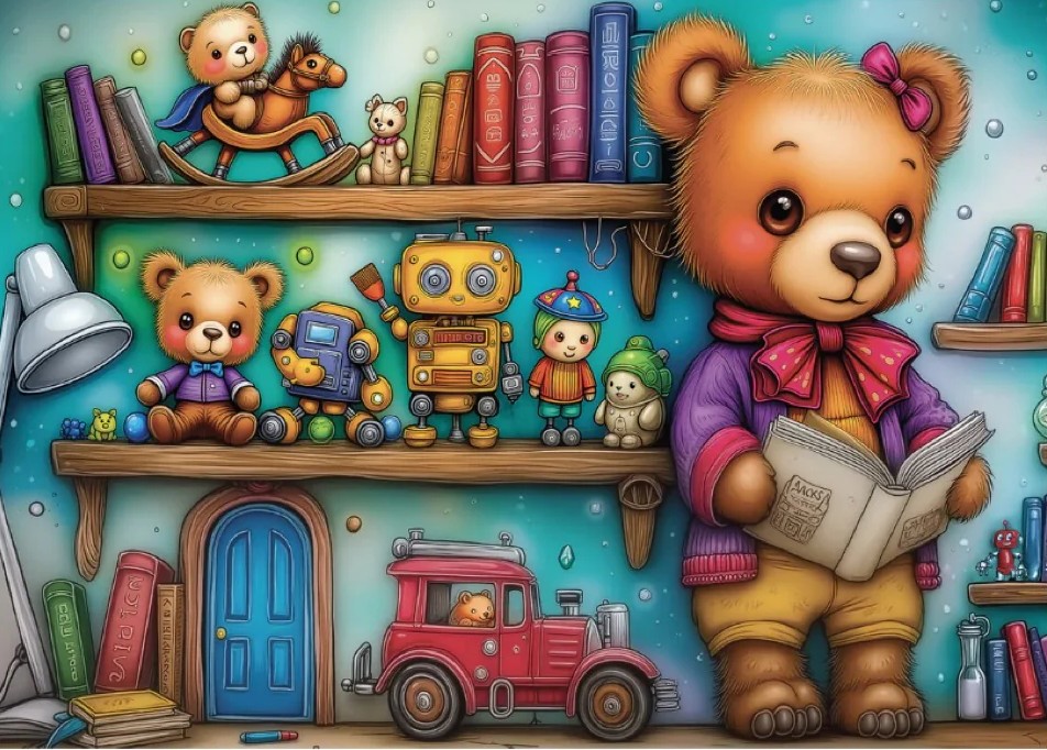This delightful jigsaw puzzle invites you into a charming teddy bear’s room filled with books, toys, robots, vehicles, and tiny treasures waiting to be discovered. Every shelf tells a story, blending warmth, curiosity, and playful detail into a picture puzzle that feels comforting and joyful from the very first piece.