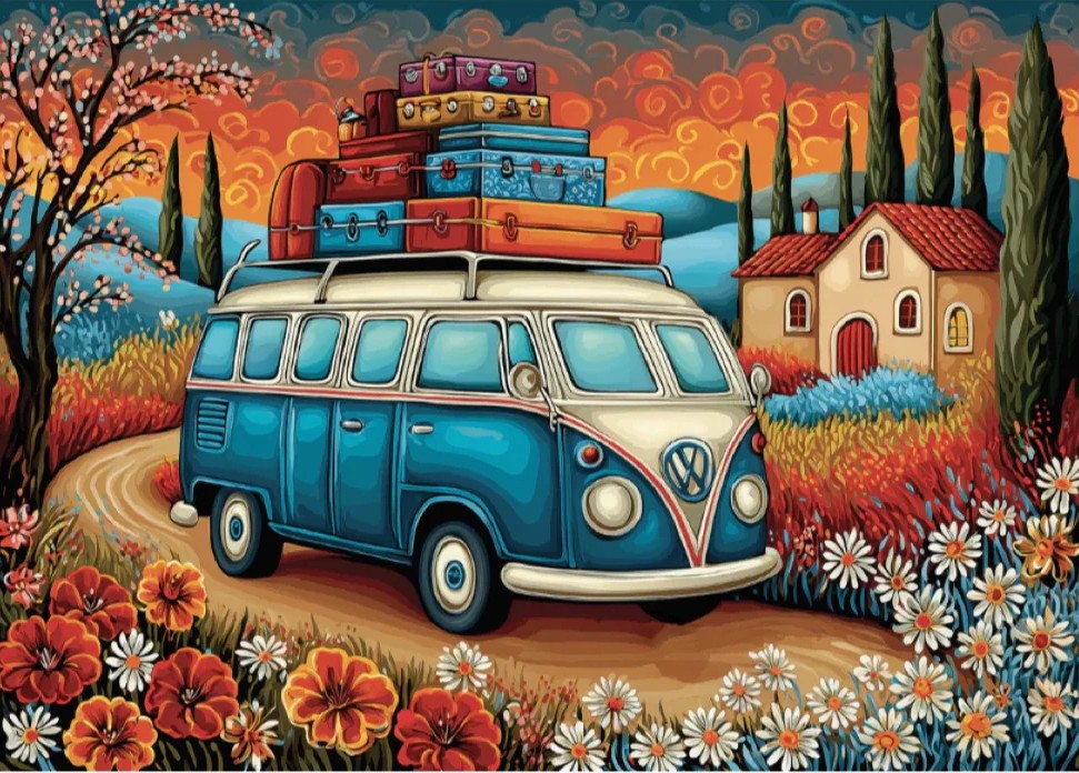 Van Life Escape captures the spirit of freedom and travel, featuring a classic van packed for the journey, winding through a colorful countryside filled with blooming flowers, rolling hills, and warm sunset skies. Every detail radiates wanderlust and relaxation, turning this picture puzzle into a mini getaway you can enjoy piece by piece. It’s a perfect choice for fans of beautiful puzzles who dream of slow travel, cozy escapes, and carefree exploration.