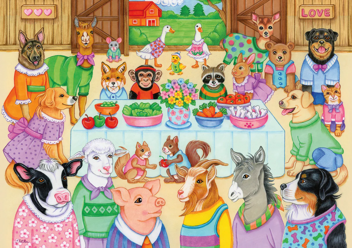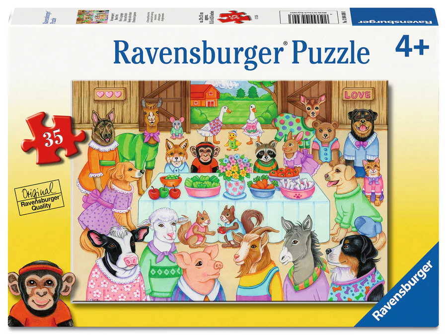 Dress up in your finest and join the fun at the Barn Party! This charming Ravensburger 35-piece jigsaw puzzle features a lively gathering of animals dogs, a cat, cow, sheep, pig, goat, donkey, deer, rabbit, squirrels, and more. Even Mr. Monkey has stopped by to see his friends