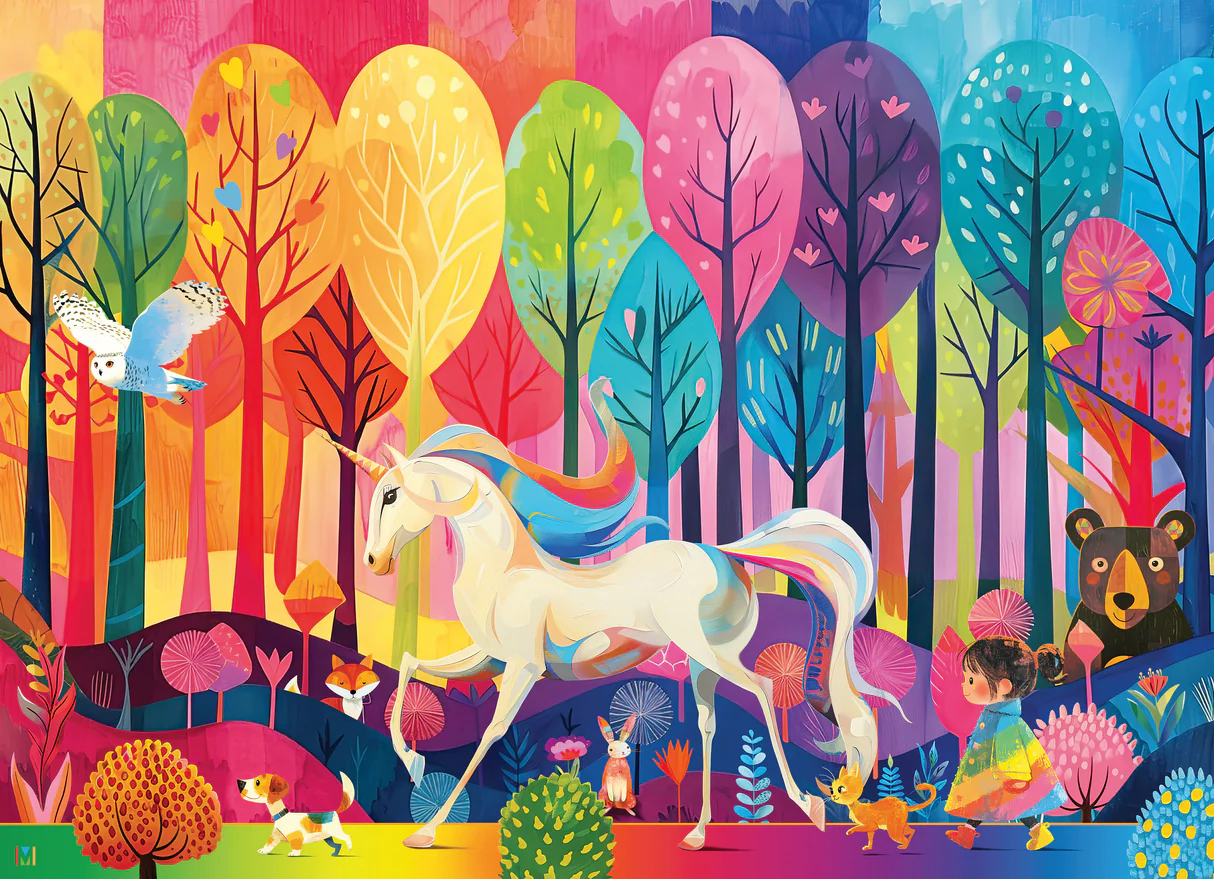 Guide your childs imagination through The Fantastic Forest with Ravensburgers high-quality 60-piece puzzle. Join the snowy owl and courageous dog as they lead the way, with the majestic unicorn helping the curious kitty and brave little girl on their quest. Where do you think theyre going? Are they searching for someone? This enchanting puzzle is perfect for ages 4+