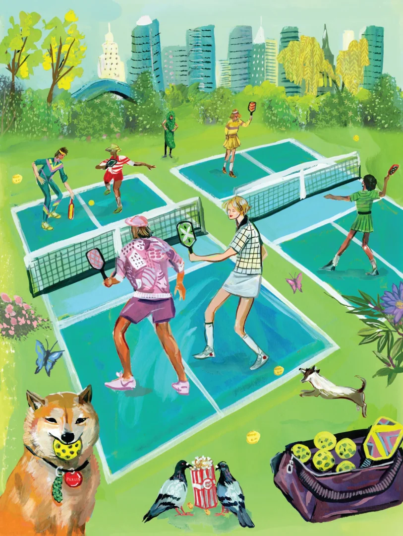 A lively afternoon unfolds in Pickleball, a dynamic 500 piece jigsaw puzzle illustrated by Jenny Kroik. Set in a bustling city park, the scene captures players mid-rally as pickleball courts buzz with energy, movement, and neighborhood spirit.